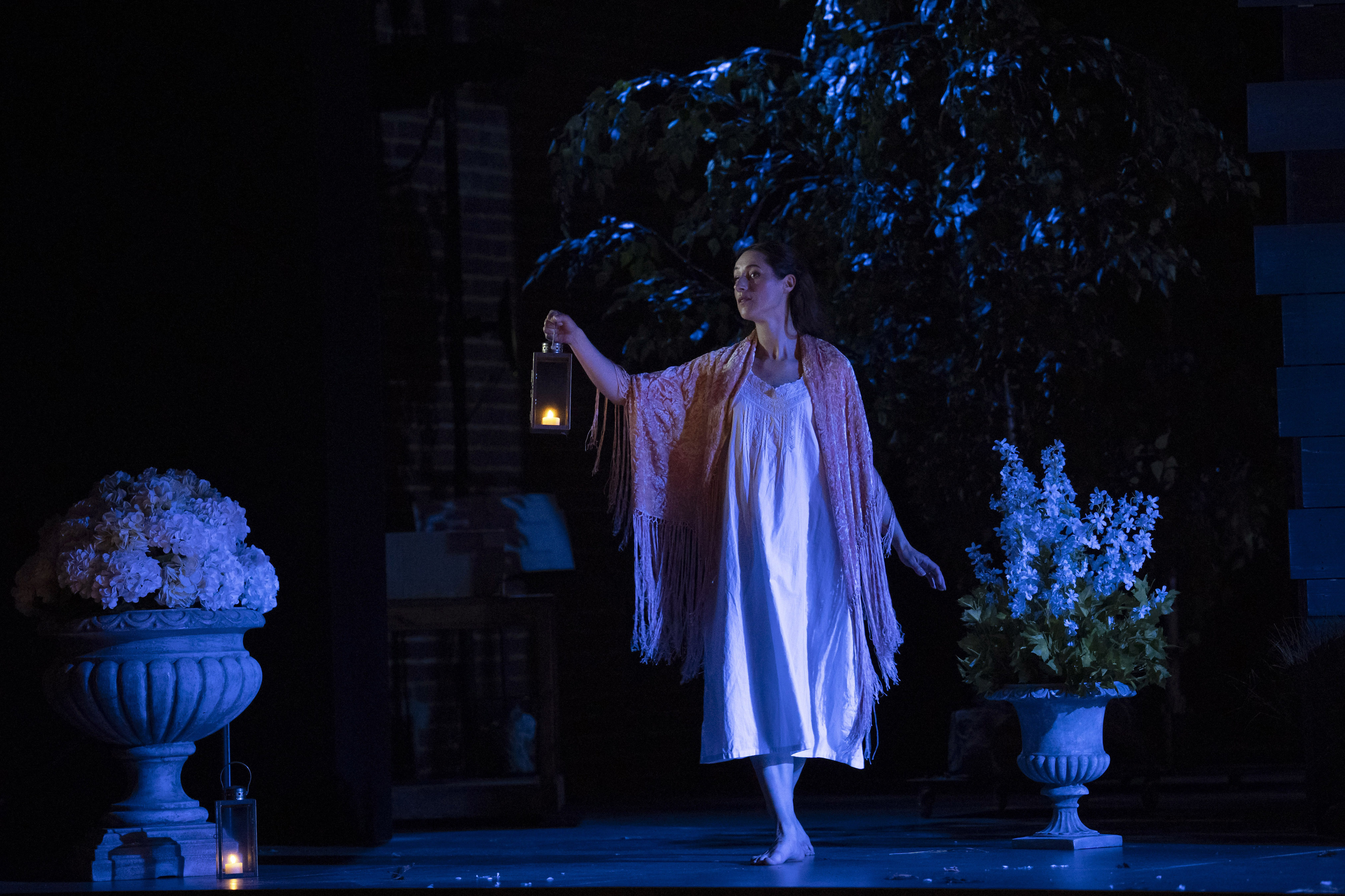 Art and (onstage) life meld and blur. The opera and its singers repeat the same motif of two women (Lotte Betts-Dean and soprano Susanna Hurrell) smitten by the same apparently charming but commitment-dodging man (baritone Marcus Farnsworth). Director Gregor (Edward Hawkins’s fruity bass-baritone) tries vainly to keep the feelings of the piece and its players separate, while Gary Matthewman is the stalwart rehearsal pianist. As presiding spirit, the famously commitment-averse Chekhov himself briefly appears at the start and close – accompanied by a distinctly real dog.Lighting and video design (Danny Vavrečka and Sasha Owen) effectively echo the romantic turmoil of the characters, and the run-down rustic charm of the (operatic) estate adds to the Cherry Orchard ambience. I felt that Hewer, following Boyd and Matthews, spun the revolve distractingly often as the double love-triangle, both in the piece and among the players, pursued its parallel course. But Betts-Dean in particular, as singer Vanessa and character Varia, brought emotional subtlety and vocal strength to each side of her role. In her case, character and performer never quite coincide; she made that distance touchingly clear. Farnsworth too made his onstage Misha more attractive than the cynical Marcus who plays him, while Hurrell’s Nadia/Natalie (pictured above by Richard Hubert Smith) found impassioned sincerity as well as heedless naivety in her yearning for the man who always gets away.