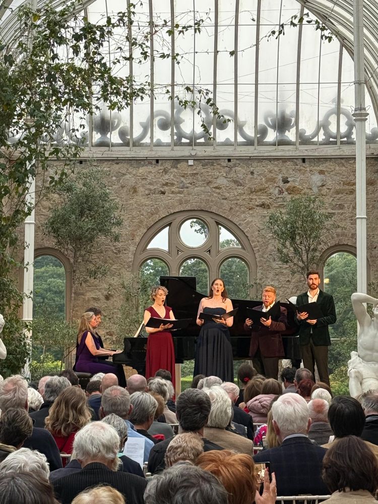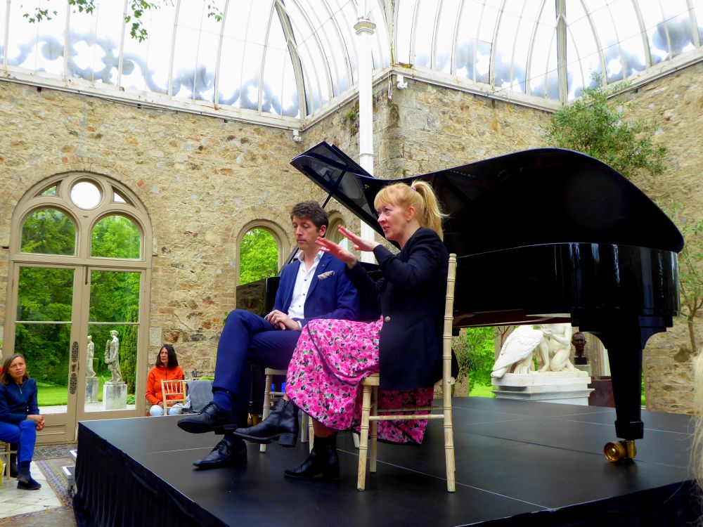 The highlight, perhaps, was The Little Galway Bay Suite, commissioned from the viola-player of the Arditti Quartet, Garth Knox, for the 2024 Cellissimo festival there and premiered by Alban Gerhardt. Butt was accomplished enough to sing in the third of the four atmospheres evoking the sea Sounds around Galway which punctuate the Bach-with-a-twist of the bracing main movements. Higgins was also to the forefront in the first of three concerts in her ingeniously-planned morning, noon, afternoon and night sequence at Kilruddery House, its Orangery the bright, white location, looking out over the beautiful gardens with their Le Notre-style "long ponds" and massive beech hedges. Finghin Collins begins his note for a superlative CD piano selection, "The bright day is done", and in a post-concert talk with Higgins (the two pictured above) told us more, in observations that she had been inspired by Gerald Barry's "Midday" in the multi-composer Ros Tapestry Suite to think about "creating a programme based around different times of day". A Farmleigh House online concert was the result, followed by the disc.