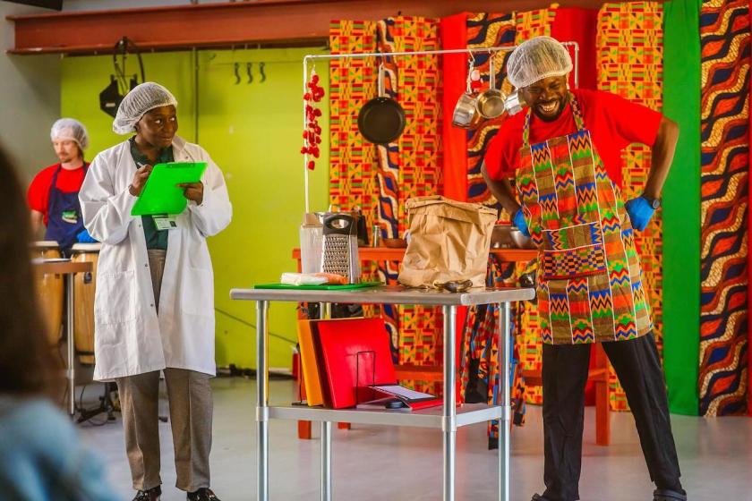 The final section of this enjoyably diverse event took us behind the scenes of a kitchen inspection with The Jollof House Party Opera, co-produced by Music Theatre Wales and Festival of International Opera. This was a spikily dynamic exploration of what opera could be, a mixture of hip hop, jazz, garage, and opera written by Tumi Williams (aka compere Skunkadelic) and directed by Sita Thomas. Based in part on Williams’ own experiences running a street food business called Jollof House Party during lockdown, it contrasted the aspirations of young Nigerian vegan chef Adeola (who’s a new father) with the personal dreams and losses of the female health and safety inspector who came to visit him. As the inspector, opera singer April Koyejo-Audiger was suitably empathetic, and the production as a whole – ranging from the percussion on kitchen equipment to the hilarious moment of crisis when human breastmilk was discovered in the fridge – was brilliantly observed.