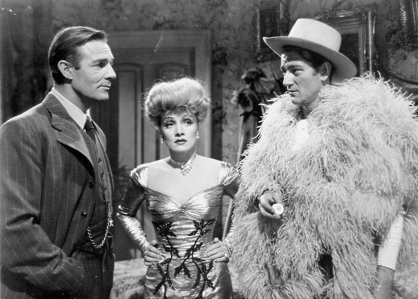 It ranges Dietrich’s saloon owner–grub staker Cherry Malotte with mine owner Roy Glennister (Wayne) and his old timer partner (Harry Carey) against the smooth new gold commissioner Alex McNamara (Scott), a crooked judge (Samuel S. Hinds), and the judge’s niece, Helen (Margaret Lindsay). Dietrich was typically attired in The Spoilers – the noble Cherry wears gleaming gowns and a cantilevered metallic Edwardian coif – but she plays second fiddle to Wayne. The actors had become lovers and Dietrich's attempts to mentor Wayne – he was still not a major star – might explain the new authority he showed as Glennister.