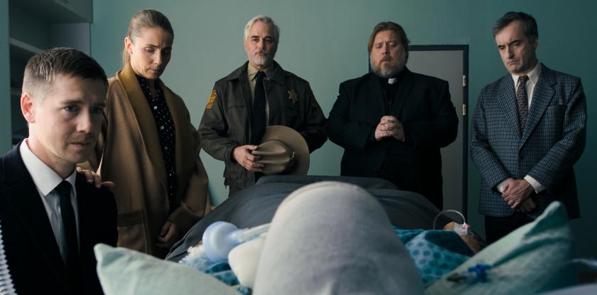 Our potential Everyman is Frank Farrelli (Pal Sverre Hagen), a mild-mannered railway ticket-seller who was laid off when the trains stopped stopping in the town. We first see him being interviewed by the Commission: the Karmack county sheriff (Paul Gross), the local pastor (Nicolas Bro), and the medical officer (Don McKellar). Frank has an even higher authority to answer to: his widowed mother.