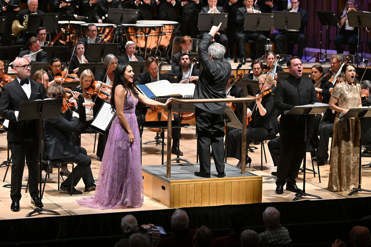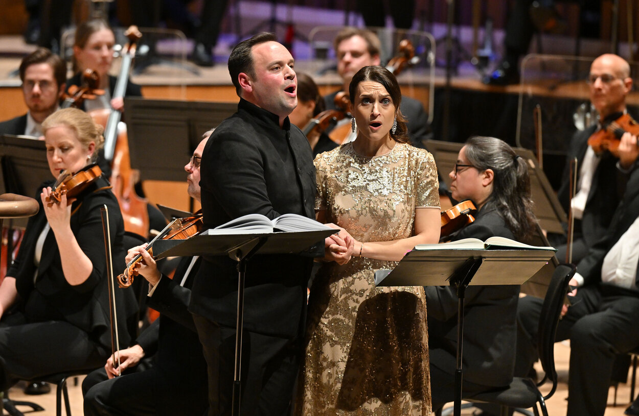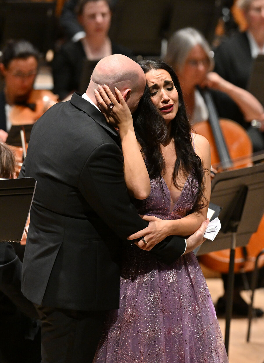 All of which risked leaving the singers in second place, decorating the orchestra’s musical drama rather than driving it. A late cast change saw soprano Nadine Sierra (a glamorous musical presence at the reopening of Notre Dame earlier this week) replaced by Carolina López Moreno (pictured below with Michael Fabiano) as an unusually youthful Magda the “swallow” of the opera’s title. Vivacious and dramatically committed, López Moreno seemed at odds with her Ruggero (Michael Fabiano) as to whether this was a semi-staging or a straight concert performance. Her theatricality chafed against his score-bound reserve, romantic chemistry the chief casualty.