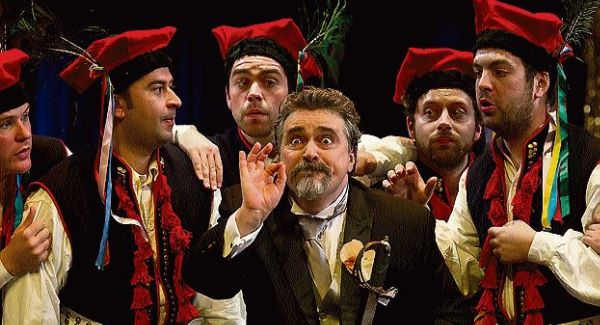 It all starts so well, as 18th Century ladies and gentleman are freed from a storage facility packing-case, their card party jostling with a contemporary rival gathering across the stage. The world of Poland and Paris collide in a lost-in-translation plot that sees Henri de Valois named king of Poland. Banished from his homeland, he finds himself the chief schemer in a plot to overthrow himself (I told you it was G&S) and romping with a variety of local women, only to find his erstwhile paramour Alexina (originally seduced in Venice, and now accompanied everywhere by a gondola) suddenly reappearing together with her husband le Duc de Fritelli (Frédéric Goncalves, pictured above). Got that?