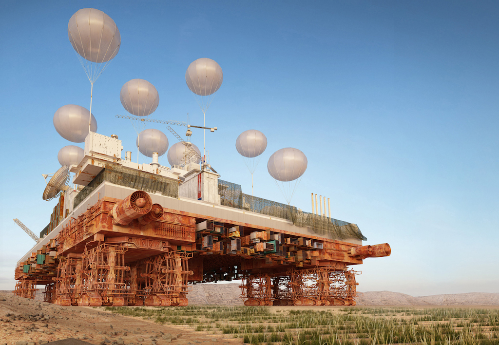 WORKac and ANT Farm offer a floating island with an inflatable cover coated in solar panels. Containing housing, a research lab, greenhouses, gardens and an algae farm for biofuel production, it also has an “interspecies congress hall” that allows the inhabitants to communicate with marine organisms, presumably the jellyfish that will be choking the warm seas along with our plastic waste.