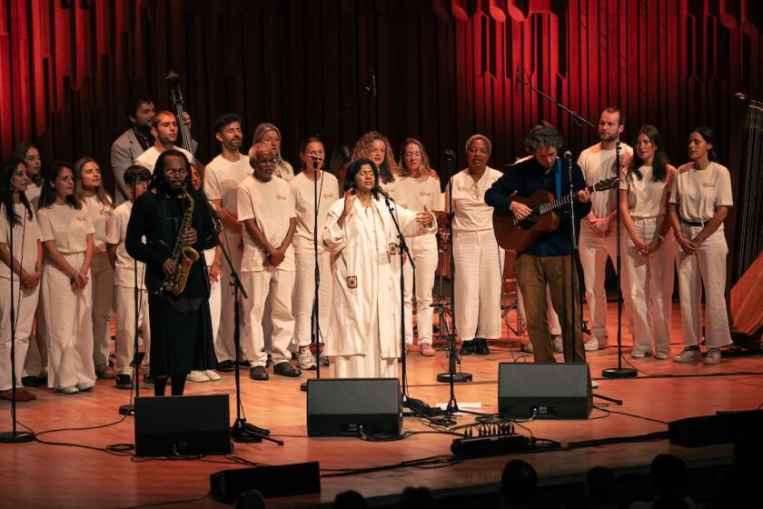 Ganavya was supported by a talented group of musicians: Charles Overton and Miriam Adefrid on harps, Max Ridley on double bass, and Jay Verna on piano. Their presence is minimal, providing a discrete and drone-rich background texture rather than enabling their considerable individual gifts to shine. For this London concert, she’d invited a series of friends who joined her on stage. It was, she said, a way of paying respect to people she loved, and from whom she had learned about music and life. These included the 30-strong Love Supreme Choir, and several solo singers, Immanuel Wilkins on mellifluous alto sax, weaving in and out of her vocal lines, the versatile singer and writer Sam Amidon with whom she performed a jointly-written song that was touching in its quiet modesty, and the percussionist Kweku Sumbry whose deft playing of djembe and other drums felt a little out of place.