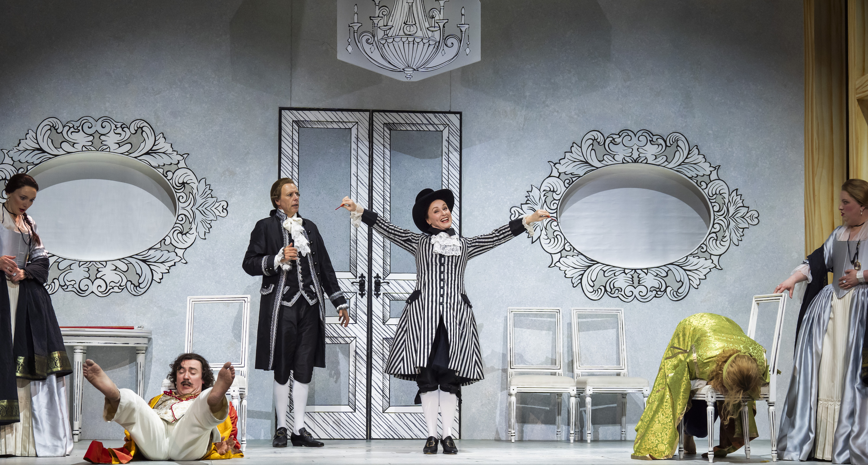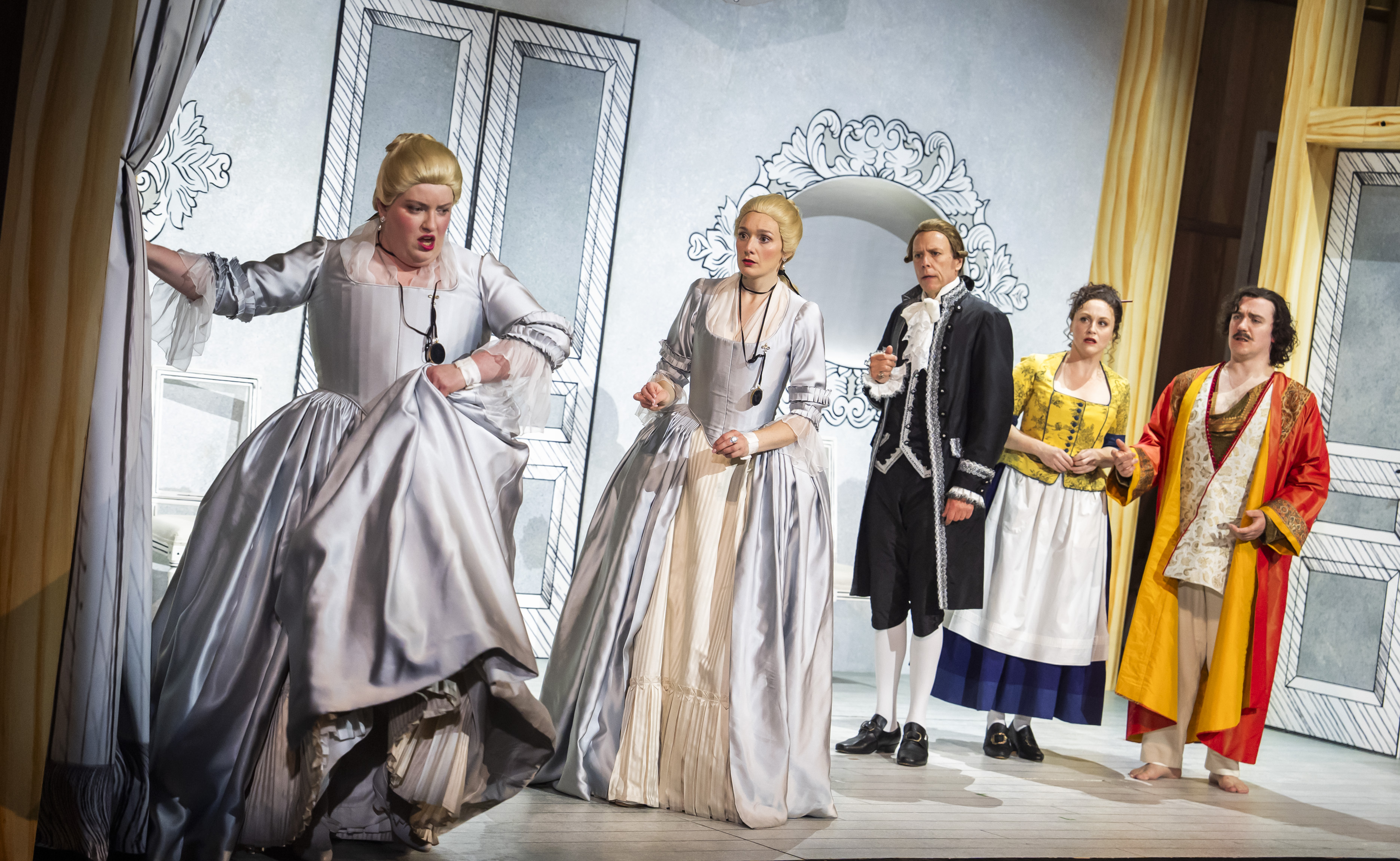 The Nevill Holt festival now spans various art-forms, but with opera still in pride of place. Its 400-seat theatre, housed in a converted stable-block next to the picturesque low-slung house whose earliest parts predate 1300, reached the shortlist for the RIBA Stirling Prize in 2019, and won the prize’s “people’s vote”. Inside, old ironstone blends pleasingly with new dark wood. With audience-friendly sight-lines, an intimate, involving acoustic and well-designed orchestra pit, the venue make a smart match for chamber-sized Mozart.Stinton and her designer George Leigh stick to compact, lightly-stylised 18th-century interiors and costumes: the downside being that we lose any sense of the open seas beyond Naples, on which the lovers (supposedly) depart for military service as Alfonso’s vicious “experiment” begins. In the production’s favour, the closed rooms become framed laboratory-stages on which Alfonso, as theatrical mastermind, aims to mount his immorality-tale about female infidelity. From the outset, as he scribbles away during the overture at the script that will tell Fernando and Guglielmo how to trick their lovers Dorabella and Fiordiligi, he is the on-stage impresario who seeks to run the whole cold-hearted business. Sometimes the chorus – only eight-strong, but robust and resourceful – do a bit of the directing themselves, while scripts, spotlights, a costume-rail and even a toy theatre extend the backstage conceit (Pictured above: Will Dazeley, centre, with Seán Boylan, Egor Zhuravskii). In Alfonso’s cynical showbiz, women can only be allowed to play the jade’s and hussy’s part. However, actors may rebel against their roles.