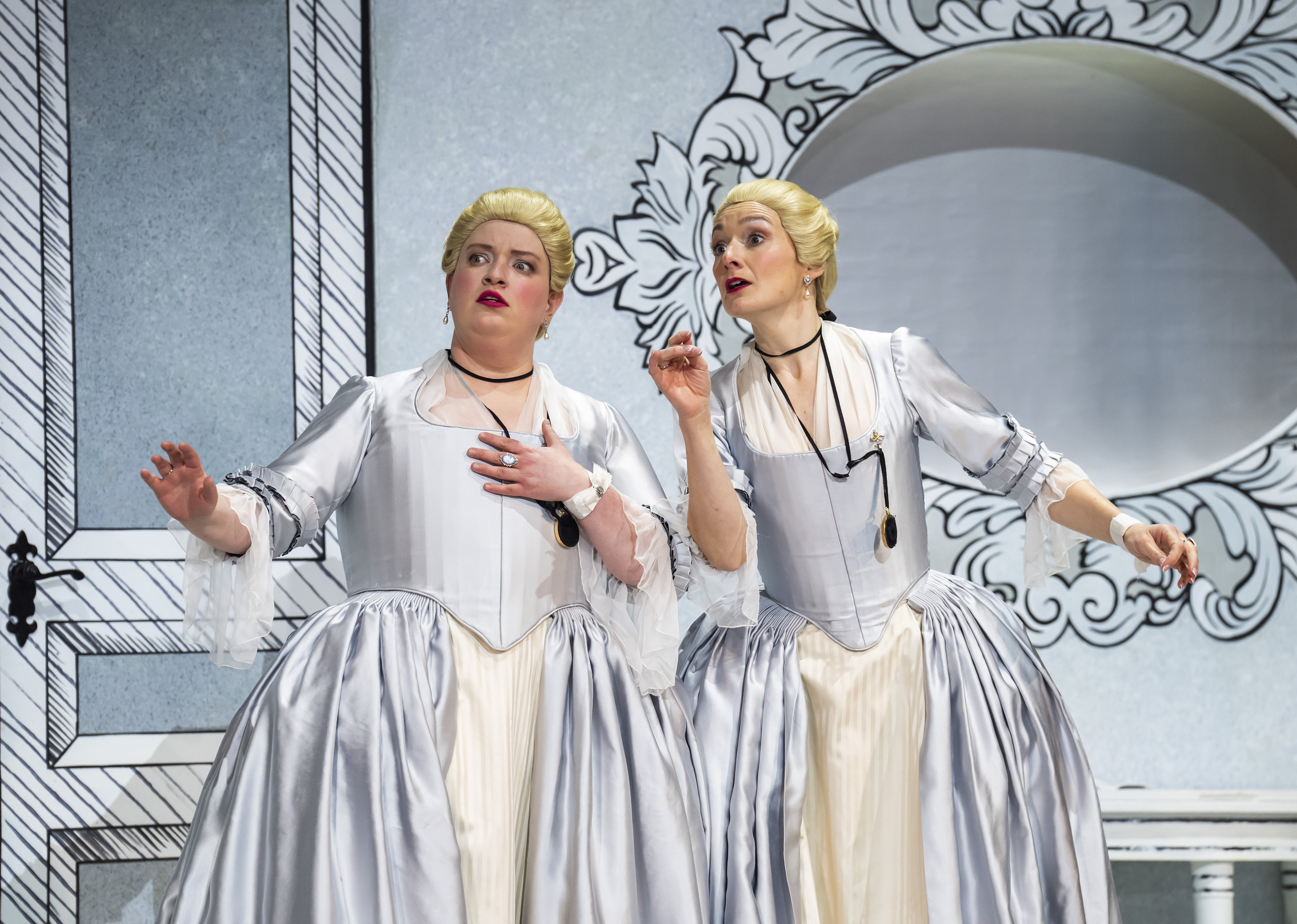 Perhaps Stinton pushes her play-within-a-play motif too hard at times. Scores can be over-fussily consulted at key junctures, although some moments – notably, when Fiordiligi (Ella Taylor, pictured below left, with Heather Lowe) rips up her assigned part at the close of “Come scoglio” – work a treat. And, as each one of the male duo tries to woo the other’s sweetheart when dressed up as romantic foreigners, we see how the manipulators may be manipulated – and how actors may get emotionally entangled in their parts. Stinton, and costume designer Stephen Rodwell, downplay the exoticism of Ferrando and Guglielmo in disguise: no “Albanian” fancy-dress headgear here; just scarlet and green robes that, as the lovers switch affections, match the women’s gowns. Music, rather than millinery, will turn these lovers’ heads, and hearts.Opera North has brought two casts to their Nevill Holt Così, with only William Dazeley’s Don Alfonso common to both. On the opening night, plenty of cohesive ensemble work made the plot-twists admirably clear – helped by lucid diction and that snappy, rhythmic English text. Duets, trios, quartets and the stupendous act-closing sextets revealed singers alert, and responsive, to one another’s movements and the pace of the action.