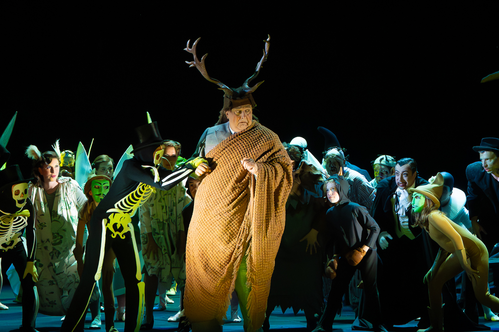 Yet, in the Attlee-era Home Counties, this upper-crust fossil must come a cropper, twice over. Jones, Ultz and movement director Lucy Burge managed the double downfall with speed and skill: first tipped from the laundry basket where he hides into the Thames, then lured into the midnight park with the promise of a tryst with Alice, and exposed. In the first, the farce galloped swiftly and dextrously to the culminating splash. In the latter, Falstaff’s horned disguise (as the folkloric “Black Hunter”, pictured below) saw him enjoyably entrapped by Alice and her well-choreographed gang of “fairies”, with Nannetta as their queen for the night.The LPO brought a special eerie glitter (and horn-led spookiness) to the wonderful Midsummer Night’s Dream-like music of this scene. Here Verdi becomes purely Shakespearean: Falstaff’s humiliation is both a ludicrous stunt engineered by an am-dram pack of pretend sprites and elves in joke-shop outfits, and an authentic dark night of the soul, touched by real magic, that ends nobly in recognition and redemption. This production captures that doubleness without missing a nuance or a beat. The stunning final fugue saw both principals and the Glyndebourne chorus in terrific voice, while the Garter barmaid served them (and the conductor) drinks. In this iteration, rich in feeling as well as fun, Jones’s deserves to, and surely will, reprise its success. As for those snail’s-pace scene-breaks, I’m sure that the Windsor WI – not to mention the local Brownies – could soon sort out it out.