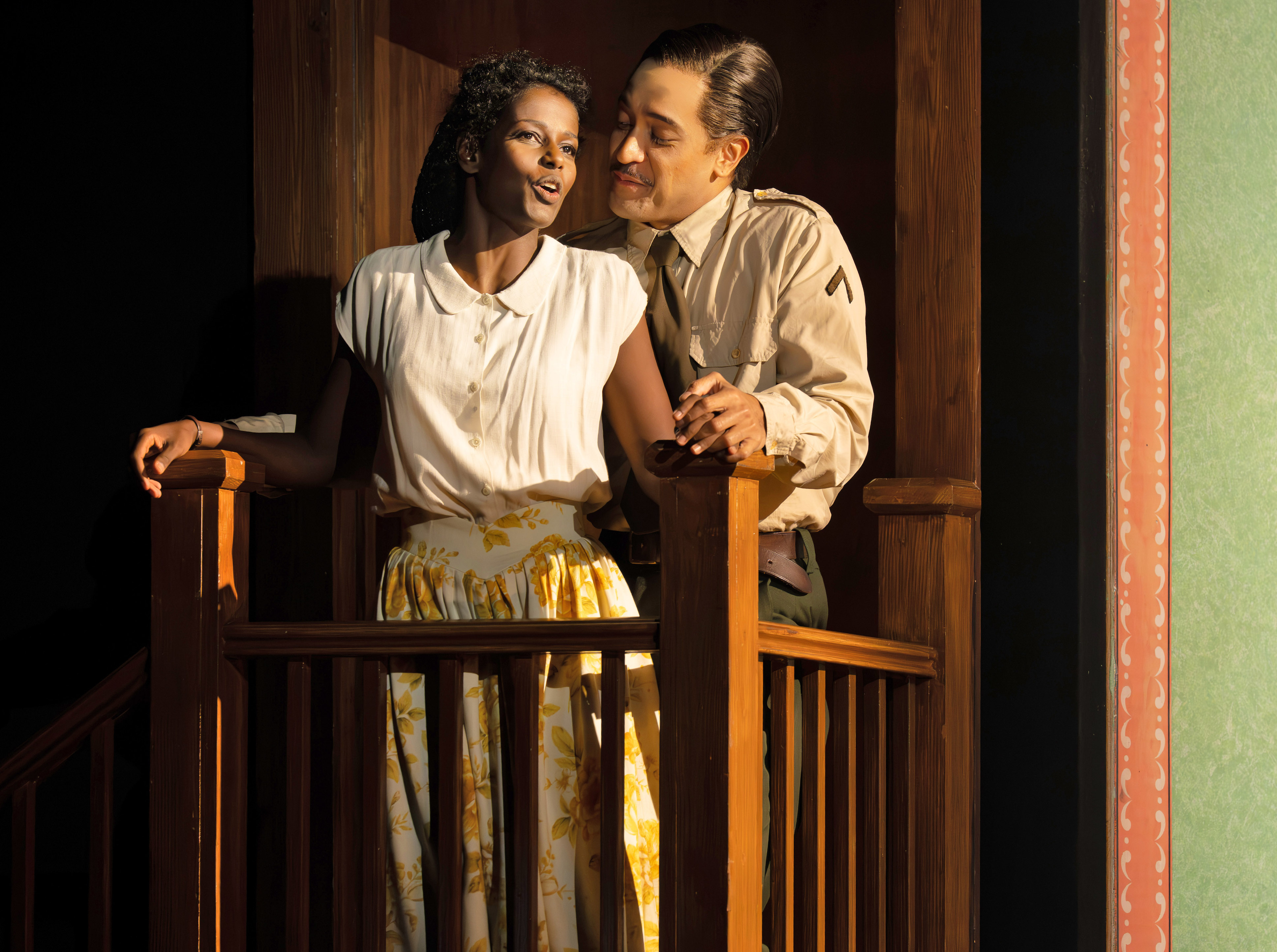 If the pub’s gloomy saloon (complete with its chuckle-machine cat, looming antlers and royal portrait of George VI) reminds the penniless old gent of past glories, then Ford’s trim suburban abode with its military veg patch celebrates the prim postwar bourgeoisie where he will never be at home. Above all, modern women with brains (and pluck) will outsmart the randy old goat.Anna Princeva’s Alice Ford sounded more strident than confident at first, but settled into a firm, bold and relaxed manner as she got into her stride as Falstaff’s scheming nemesis. Stephanie Lauricella’s Meg Page, the second Merry Wife, provided sturdy and refined mezzo back-up. Still, Mariam Battistelli as the Fords’ daughter Nannetta – enamoured of Filipe Manu’s Fenton, played here as an American GI – outshone both wives (pictured above). Her romantic ardour fuelled some glorious top notes, and she communicated a captivating warmth throughout her range. And Valentina Pernozzoli’s Mistress Quickly – implacably stolid in her ATS uniform – absolutely devoured the show-stealing chances served up by her role. She was a delight to watch, and hear, even pretending to flirt with the lubricious oaf as she reels Falstaff into the trap that will see him humbled twice (pictured below, left, with Anna Princeva, Mariam Batttistella and Stephanie Lauricella).