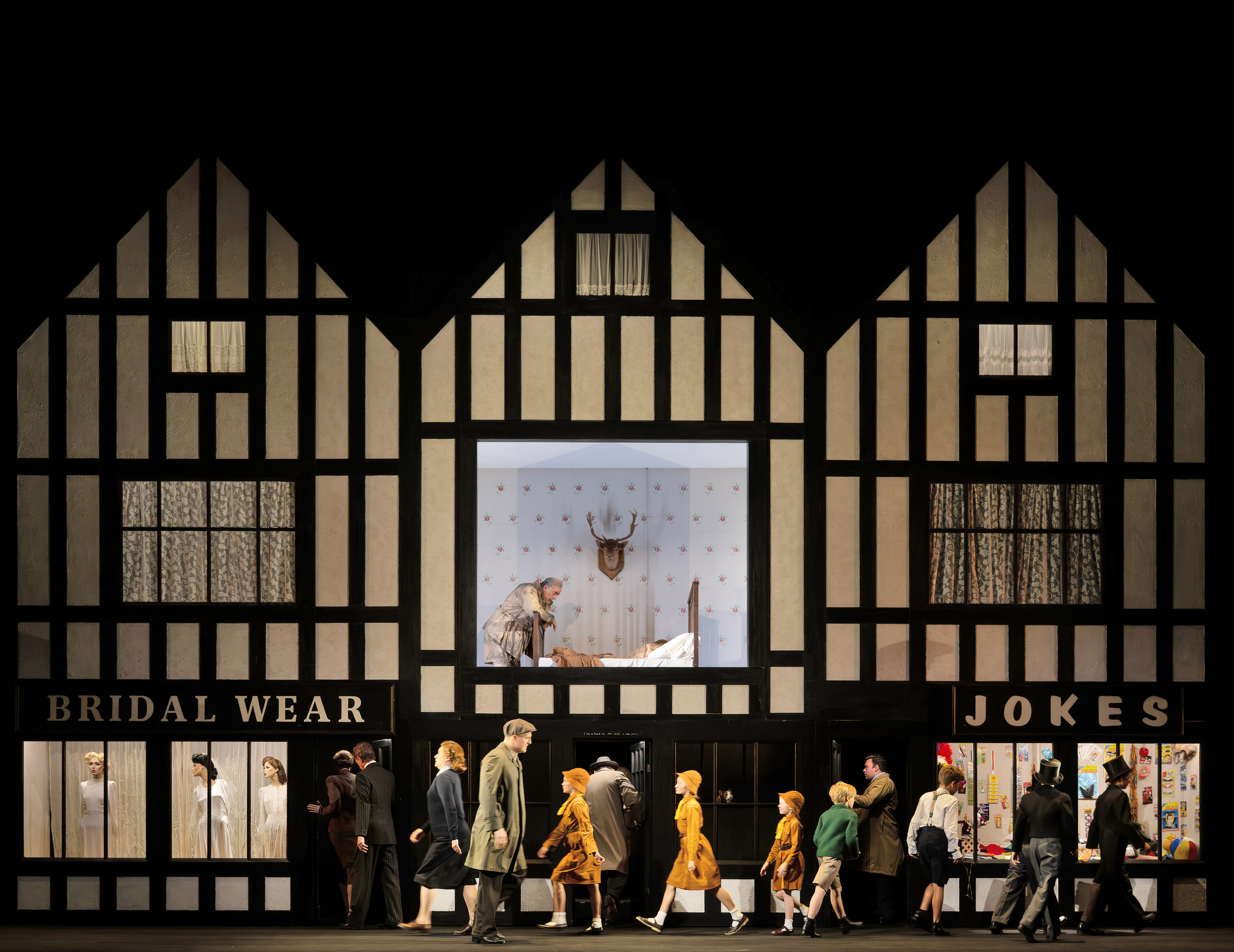 Led by Renato Girolami as Shakespeare’s ageing bulky knight, thwarted in his hopes for an amorous swansong in Windsor, a gifted and committed cast tears into this miraculous score with sackfuls of idiomatic verve. In the pit, the London Philharmonic Orchestra supply luxury-level support, with conductor Sian Edwards letting us hear the character and colour packed into instrumental parts that don’t merely accompany, but lead their own merry dance. But – and on the first night, it felt like a substantial caveat – designs, however lauded, should not run the show. Yes, Jones's and Ultz’s late-1940s setting abounds in delicious touches, from the Brownies who work at the railway poster-style tapestry of Windsor Castle and the Thames to the mock-Tudor high-street shopfronts (the Garter’s flanked by “Bridal Wear” and “Jokes", pictured above). Yet the scene-changes simply took far too long, leaving a chatty, then restive, audience in limbo. Everything in Falstaff depends on pace and agility: the near-octogenarian composer’s music bustles, swerves and pivots at a fantastic lick. Those interminable breaks made it feel that we were watching not a forward-looking piece of modern music theatre but the sort of archaic Grand Opera where the scene might have to move, not from street to street in suburban Windsor, but from Pharaoh’s palace to Roman Forum.