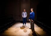A House Repeated is one of those things that makes perfect sense when you’re there. It’s super-easy to understand, but whenever I do any press or write publicity copy it’s difficult to communicate quickly. Without trying to be pithy, here’s how it works. Zoe and I are standing on a bare stage between two banks of audience, so the audience is seated traverse, one half of the audience is facing the other half, and we’re in the middle. After the intro and all that, I turn to my half and I describe a place: “Imagine you’re standing outside. In front of you is a building.” That kind of thing. Then I give some options about where they might go and ask them what they’d like to do: “You can go through the door; you can go upstairs?” Go upstairs. Turn to another another member of the audience: “In that room you’ll find this.” Maybe there’s a bottle on the table, what do they want to do? They can interact. Zoe’s audience are also giving her instructions as to how to explore this imaginary environment. Now, as they navigate their way through, maybe a narrative or an implied narrative starts to unfold. Two different audiences are each controlling a different explorer, an avatar, and might see what the relationship is between them. That kind of thing. It’s hard to get that down in less than 50 words for a brochure.