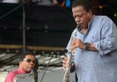 Bilal then let his liquid phrasing loose on “Too High”, with a captivating solo from harmonica player Grégoire Maret and funky comping from guitarist Mike Severson, before detonating the incredible power of his falsetto on his self-penned “Levels”, which concluded with an impressively vast, pulsing wall of sound. (Pictured above: Robert Glasper and guests including Bilal. Photo by Emile Holba for the EFG London Jazz Festival.)