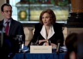 The film introduces its central sparring couple at a lecture Stateside, where Emory University professor Lipstadt is heckled from the floor while giving a talk for her latest book by the unrepentant gadfly that is Irving, Waving $1000 by way of provocation, Irving proceeeds to deploy both his age and experience – and the fact that he is English – to challenge Lipstadt (and anyone else) to prove that the Nazis did in fact gas Jews at Auschwitz. From there, Irving ramps up his needling to pursue Lipstadt for libel in court, where she is quite rightly astonished to discover that in Britain she will be presumed guilty unless proven otherwise; America's vaunted presumption of innocence is nowhere to be found.