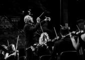 Was it going to be generic contemporary? The skeetering strings at the beginning suggested as much. But their headlong collision with a chorus of sustained chords proved arresting: what sounded like a pre-recorded ambience turned out to be those same strings turned to calm seas. In effect much of the one-movement concerto was searing cadenza from the compellingly intense Batiashvili (pictured below with Hillborg, Oramo and members of the BBC Symphony Orchestra by Mark Allen), mostly accompanied until close to the end and punctuated by two wild eastern dances – part Turkish sanat, part Bollywood, with Hillborg making and needing no apologies for the populism.