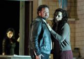 The dumbshow (scored to a Bob Dylan soundtrack) looks like nothing so much as a Building Society advertisement. Would Claudius really confess his sins to Hamlet (and would he, hearing them, really not shoot him on the spot?); would a modern-day Ophelia really accept so much, so quietly from her lover as Jessica Brown Findlay uncomplainingly does? Both she and Stevenson struggle to find their place in this updating, and Icke’s insertion of a dubious Quarto scene between Gertrude (Juliet Stevenson, pictured below with Wight and Scott) and Horatio suggests a recognition (if not a satisfactory solution) of the problem.