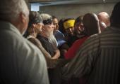 The Work follows the experience of participants in an intensive four-day therapy programme that is run at Folsom twice a year: they include outsiders, who have volunteered to join the therapy sessions, and inmates with the same motivations, as well as a range of facilitators, all of whom have been through the course before. Apart from the daily scenes of the incomers arriving at and leaving the facility (pictured below), the entire action is set in the prison chapel, which seems to accommodate around 60-80 men, divided variously into groups and sub-groupings; they enter an “Inside Circle”, reflecting the spatial arrangement of their interactions (lower picture). (The programme appeared at the end of the 1990s, and is coordinated by the Inside Circle Foundation, its motto “Helping prisoners and parolees heal from the inside”.)