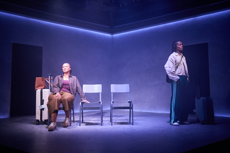 As serious as its themes, it’s an often extremely funny and buoyant piece, not least in its opening, as Joyce and Erica meet at a London airport for the flight to Guyana – Joyce’s first since she left there as a young child, and Erica’s first ever (Rosheuvel and Wright pictured below). It’s quickly apparent that the two are chalk and cheese: Joyce determinedly superficial, quick to drink, emotionally reticent; Erica earnest, open about her therapy and desire to deal with her issues, most of which involve a childhood in which she remembers her mother as largely absent.