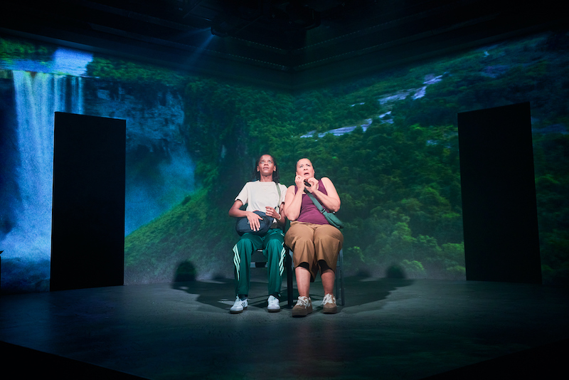 The Bush’s former artistic director Lynette Linton returns to direct the play, and with her skilled production team creates a vivid setting in which her actors can thrive. With the pair occupying an open box, bare other than for a couple of chairs, the interplay of sound, lighting and video design moves the two between time and place, London flats and Guyanese beaches and waterfalls (pictured above). The actors also help to evoke atmosphere: Wright’s enthusiastic description of Caribbean street food is positively mouth-watering.