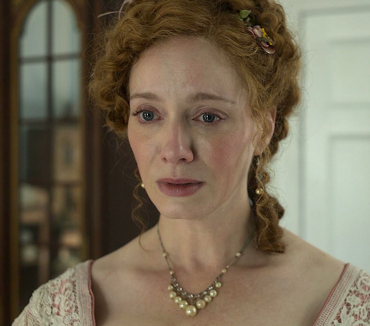 But obviously she shouldn’t have, since we’re only minutes into the episode when Nan is wailing that “I’ve made a terrible mistake – I’ve married the wrong man!” But no matter. Christina Hendricks returns as Nan’s mother Patti St George (pictured below), with Adam James as her husband Tracy, while Imogen Waterhouse plays Nan’s sister Jinny. Guy Thwarte (with whom Jinny is in the process of eloping to a picturesque Italian seaside village) is portrayed by Matthew Broome.
