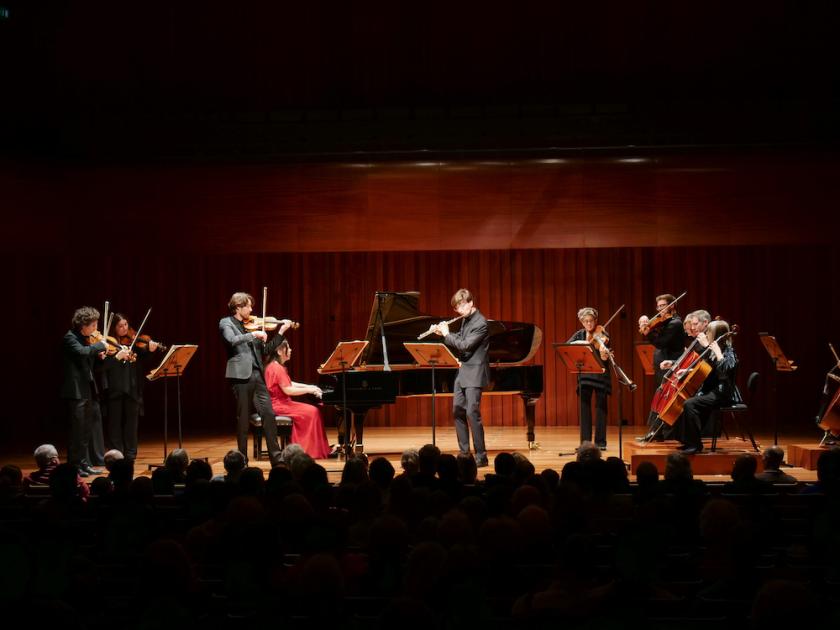 So it was fitting that we started with the fifth Brandenburg Concerto. This had Gould and flautist Thomas Hancox as soloists, with van den Bercken on the piano (the three pictured below), starting in the role of accompanist before elbowing her way to the fore in what she described as “the first piano concerto”, the beginning of a path that ultimately led to Rach 3. It is unusual to hear Bach ensemble music with a piano, and some people would reject it out of hand. I found it sounded a bit strange as continuo, but was perfect when the extraordinary cadenza at the end of the first movement emerged, Bercken’s lightning-fast ribbons of notes flowing like melted butter, and we could see in this Bach a glimpse of the concerto’s future as a form.
