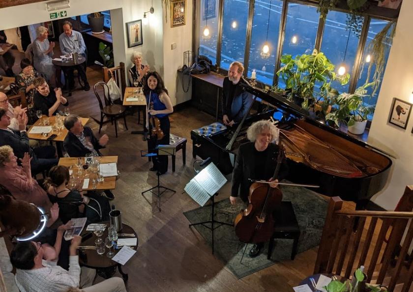 Fauré’s slow movement in his D minor Piano Trio, an astonishing, in-love-with-the-world feat from the outwardly frail end of his life, goes even further. As the violin and cello unisons grew ever more ecstatic, Isserlis seemed to be in another world, and then we were there too, without knowing how it had happened. The elusive harmonic journeys which make the composer unique among the late-romantics were effortlessly charted by Beatson; the uplift at the end was total. And then we had the perfect “good night” of an encore from, as Isserlis put it, the only German composer who could follow these French masters – Schumann’s “Duett” from his Op, 88 Fantasiestücke. All this, and the unbelievable good fortune of being a couple of metres away from these remarkable artists,, along with others in a star-studded audience: that’s the magic of the Fidelio Cafe