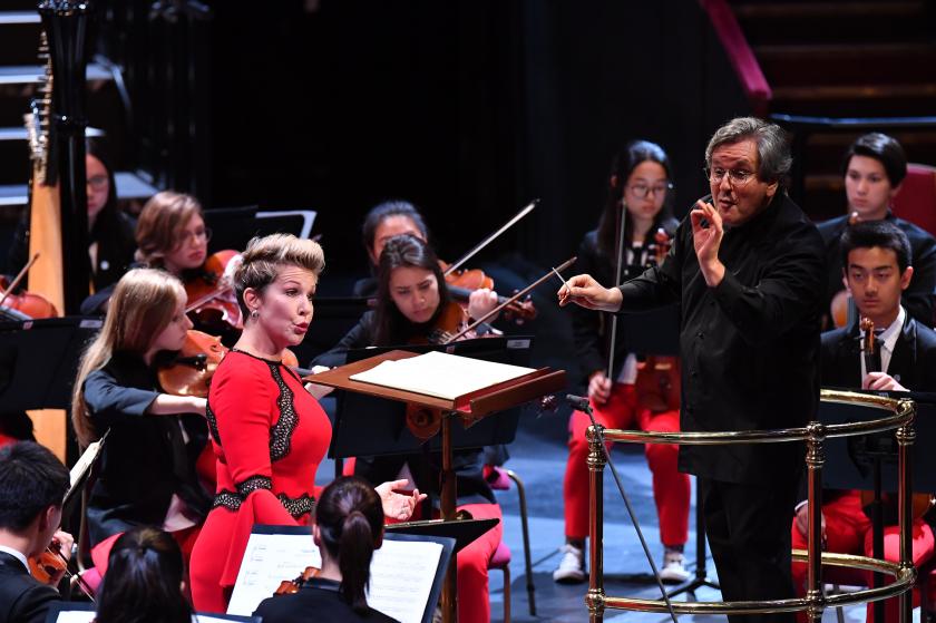 The following evening found the Usher Hall in a very different mood. Where Grieg and Gubaidulina drew, by festival standards, a thin audience, the lure of Joyce DiDonato singing Berlioz with the National Youth Orchestra of the USA was enough to fill the hall to near capacity. Like other youth orchestras, NYO-USA re-invents itself annually, with a surprisingly young age range (16-19). Dressed in vibrant red pants (as they say over the pond) and identical trainers, it looks and feels young, dynamic, and very large (pictured below with Antonio Pappano at the BBC Prom two days later). Under the skilled direction of Antonio Pappano (pictured above), they began with a muscular piece celebrating the 30th anniversary of the fall of the Berlin wall by the 18 year old Tyson J. Davis, the forthright and confident writing rather belying the title Delicate Tension (from Kandinsky’s painting Spannung). The programme note, at least, was clear in its reference to “shapes and angles that connect our time to the Cold War eras.