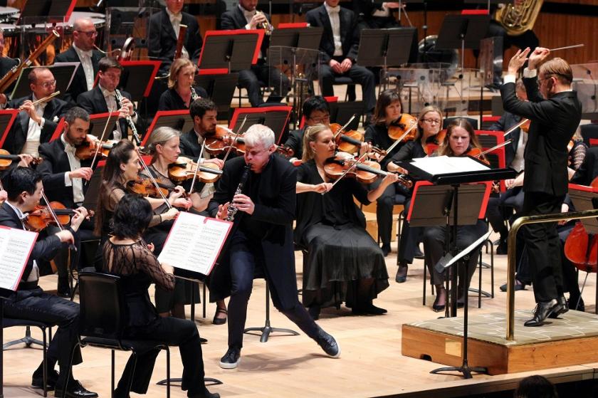 As was the performance of Weatherd, in which Clyne has incorporated so many of Frost's specialities, including his invention of, as he puts it in the programme interview, "the three-step breathing technique, which relaxes your vocal chords so that you can sing with your normal voice while playing. A technique that invented by accident". Genius. Resist reading the programme note first, and what do you hear? A noisy first movement starting with a bell chant, punctuated by clarinet reflections and capped by its soaring and swooping (perverse if original to score for such a big orchestra versus such a soloist; Nielsen's masterly Clarinet Concerto, which I'd been excerpting in Fröst's recording - and Benny Goodman's - for a Zoom class yesterday afternoon, sticks to strings, double woodwind and a significant side drum).