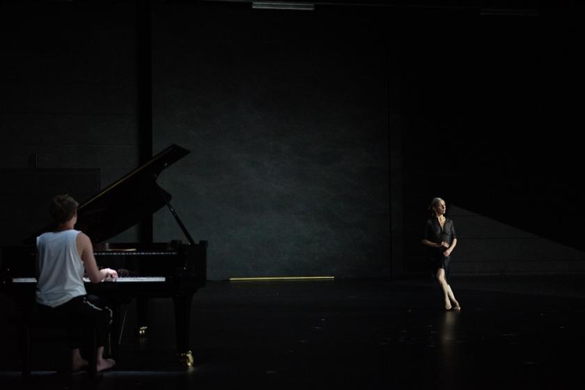 It would be simplistic to say that those movements veer between the fluid and the jerky; there’s a great deal of variety, and no repeats in the music have the same reflected dance (Kolesnikov is still at liberty to be free with them, too). Strictly no humour in the dance when there’s plenty on Bach's part, though there’s an aggressing bumping of her collaborator off the piano which gets a surprised laugh, and much later the wit is in a music-less front-of-stage interlude. Much is counter-intuitive; De Keersmaeker’s first lying-down is to the moto perpetuo of Variation 5, though others make more sense tied to the stretches where the pianist, bare-footed for this sequence, uses the sustaining pedal, and the first big minor-key variation, 15 is the one where she moves under the piano and takes hold of it in more explicit anguish.
