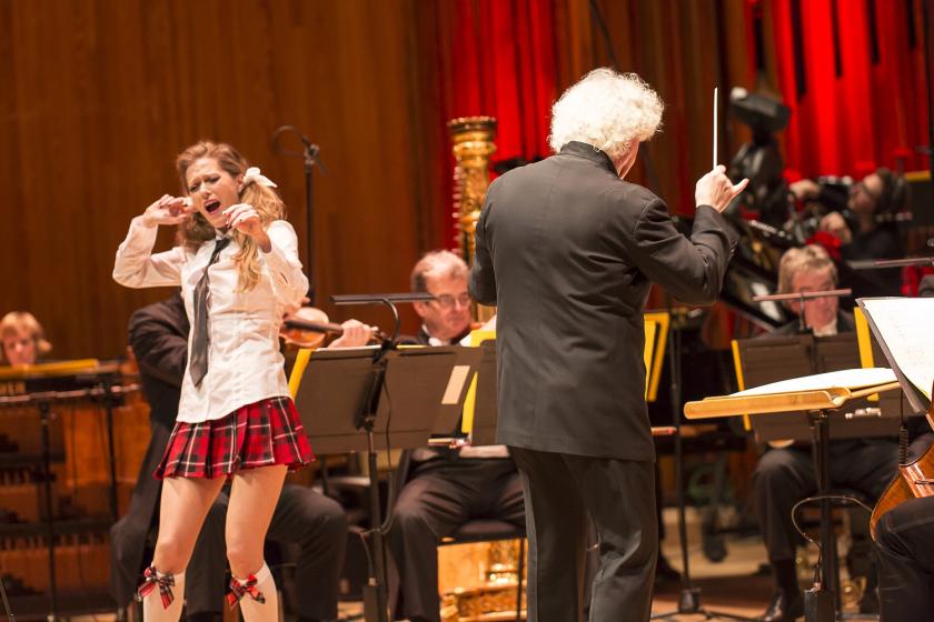 Such demonstrative physical and musical flexibility, as well as the interval for a saucy costume change, have allowed her to bring down the house many times in Ligeti’s Mysteries of the Macabre, and she has developed a slick act with Rattle. She now appeared not as leather-clad dominatrix but naughty schoolgirl still tossing off Ligeti’s coloratura pyrotechnics while barking and hissing her arbitrary instructions: beyond parody, which may be my problem with both Elgar Howarth’s arrangement and a performance that has lost touch with the political and cultural disenchantment which drove Ligeti to write the opera, notwithstanding Rattle’s theatrical cry of anguish at "Prime Minister Farage"(Rattle reacting pictured above). The laughter can be so loud that it drowns the anger.