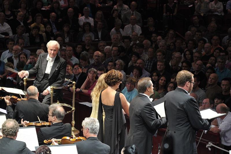 A few words of reflection on the extraordinary career of one of our most prized musical exports, a man who in his own words graduated from something of a firebrand into a wise man so mellow and softly spoken that merely the sound of his voice was strangely therapeutic. I remember in one of my first interviews with the great man my trendy voice-activated micro-cassette machine kept shutting off because it was convinced he had stopped talking. He suggested that it had a low boredom threshold. (Pictured above, Sir Colin Davis with members of the Gustav Mahler Jugendorchester at the BBC Proms; below, conducting the Missa Solemnis in the same season. All colour images on this page by Chris Christodoulou.)