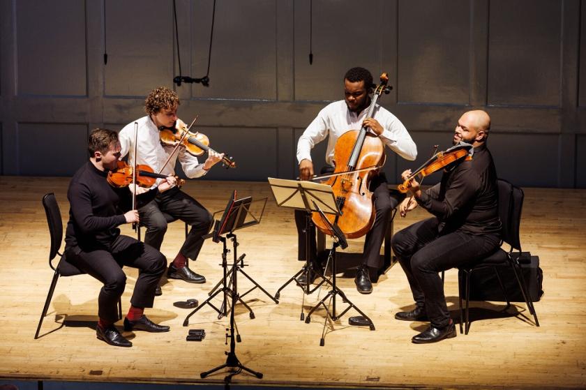 These four young men – the oldest member is 24 – were charm personified in the second of Haydn’s “Sun” Quartets, combining easy grace with carefree beauty, and using vibrato only discreetly to colour the sound carefully. Similarly, their take on the third of Mendelssohn’s Op 44 Quartets combined delicacy with warmth and terrific clarity of textures. The most interesting thing on their programme, however, was the Second Quartet by Billy Childs, a composer much better known as a jazz pianist. Calling it Awakening, Childs wrote the quartet as a reflection on a period of his wife’s serious illness, and it’s a terrific tone poem as well as proof that Childs is impressively proficient in writing for the genre. (Pictured below: Phoenix Avalon, Adrian Steele, Devin Moore and Joshua McClendon taking a bow).
