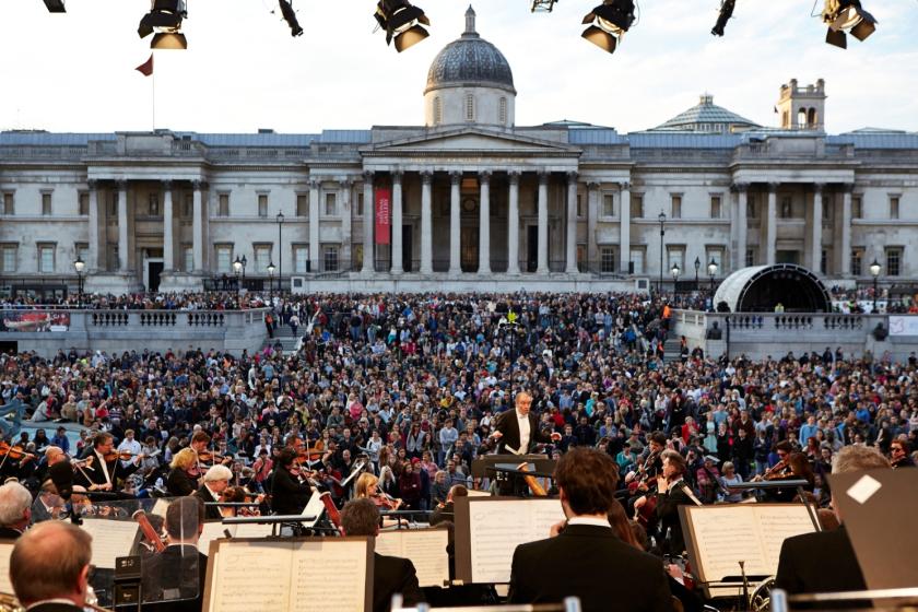 It was a truly democratic occasion: absolutely free, no seats, no special places for guests and press. Arriving just in time from inspecting Chagall windows in a Kent country church, I only just got in to sit on the ground to the far right – and this time I mean that literally – of the stage. This is the second year Valery Gergiev, the London Symphony Orchestra and its various educational wings have teamed up with BMW – OK, give them their due for what’s now become a Europe-wide al fresco phenomenon – to shake the foundations of Nelson’s Column and the National Gallery.