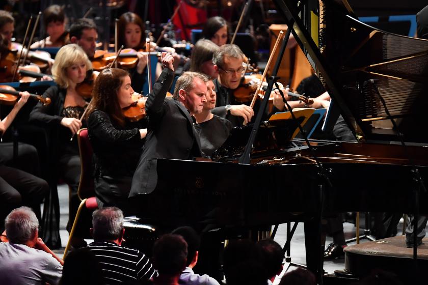 Coherence is the key word here. Ever since his Thebans opera – long in the making, first performed by English National Opera in 2014 – Anderson (pictured below with Osborne and Ilan Volkov) has pared back his orchestral textures, which were acutely heard in the first place. An opening, repeated B flat seems to test the vast acoustic of the hall, explored and filled by Anderson in several previous Proms commissions. Twenty-five minutes later, the conclusion (up a mountain, as if climbed by Carl Ruggles) opens on to another, grander vista of the kind that Tippett liked to conjure with. In between, two scintillating scherzos frame a big slow movement that fully satisfies the demands of the genre, though the piano’s rapturous melody is shadowed by a second keyboard tuned down a quarter tone. Composed for and dedicated to Steven Osborne, the concerto makes full use of the quick and vividly pictorial touch which have brought him just renown in the music of Ravel and Messiaen.