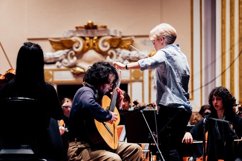 As a critic you could wait all your life for an opportunity to use the word “susurration”, and then along comes Lotta Wennäkoski’s guitar concerto Susurrus, an onomatopoeic title that aptly describes the susurration noises of an orchestra rasping, rattling, whooshing and scraping their instruments to produce an astonishing variety of sound effects. The percussion section included woodblocks and a Swanee whistle, and at one point the woodwind section brandished a forest of plastic rulers to produce a soft twanging sound.