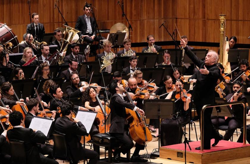Soltani can stand as the vibrant figurehead of everything Barenboim has achieved with the West-Eastern Divan Orchestra since 1999, bringing Jewish Israeli musicians together with worldwide Arab and other Muslim players, along with a few Spaniards, in a spirit of fierce collaboration that has survived against the odds. Not all the players looked as if they were quite as engaged as Soltani and his vivacious fellow cellists, but the sound was still impassioned and big: never too much so in Tchaikovsky's urgent battle with Fate as providence, though Barenboim's view of it might seem at times solidly old-fashioned, the equivalent to the Simón Bolívar Symphony Orchestra's thunderous Beethoven Five under Dudamel; in both cases, we've become accustomed to more spring-heeled interpretations. This team's interpretation of the Tchaikovsky first appeared on CD in 2005, a live recording from Geneva, and though many of the young players have changed since then, the essence is the same - heavy emotions saved from excess by the way Barenboim (pictured above) connects movements, even if the non-stop energy meant a glass of water snatched and downed while half conducting the third-movement waltz.
