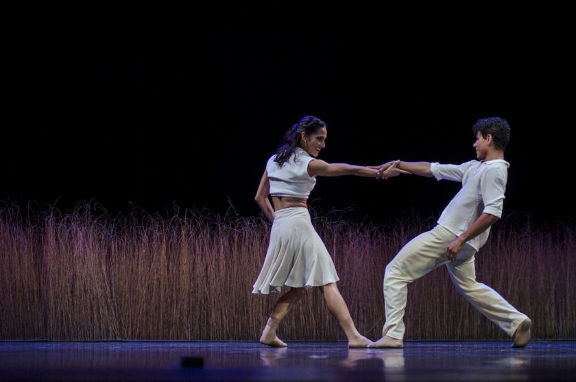 Hybrid, a new full-ensemble commission for Acosta Danza with a Hunger Games vibe, was the only piece that left me cold. I had to suppress a giggle when a maypole-like contraption descended from the ceiling, each of the 12 dancers solemnly took the end of a rope, waggled it for a bit, then watched it ascend from whence it came. The theme is loosely, very loosely, the myth of Sysiphus, condemned forever to roll a boulder up a hill, but both hills and large boulders being hard to conjure, the rope thing has to suffice and the piece, while brimming with youthful defiance, doesn't cohere.