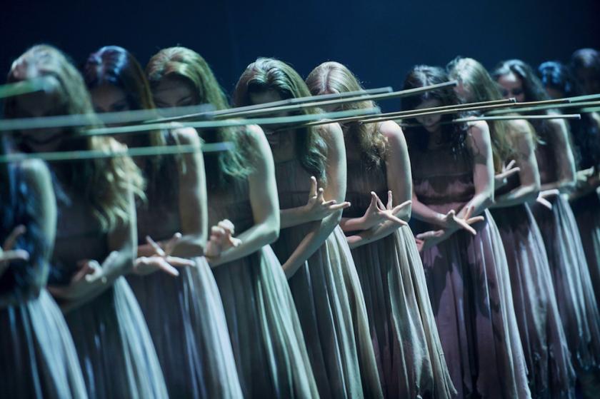 Vincenzo Lamagna’s score – for live orchestra meshed with pre-recorded sounds – establishes the change of scene, the change of century, in the first few seconds with its ominous grindings and rumblings cut with Asian accents of drums and ankle bells. Tim Yip’s stage design is a vast pitted wall which variously comes to represent a national boundary, a citadel, the limits of a giant factory – whichever, it’s efficient at keeping the great unwashed out. The opening shows a massed line of bodies ceaselessly, hopelessly pushing at it. Khan’s revision of the story hinges on the plight of low-paid workers in the global textile industry, whose economic fluctuations led whole communities to abandon rural lives – whether in Lancashire or Bangladesh – only to be left high and dry when the factories closed and investment moved elsewhere.