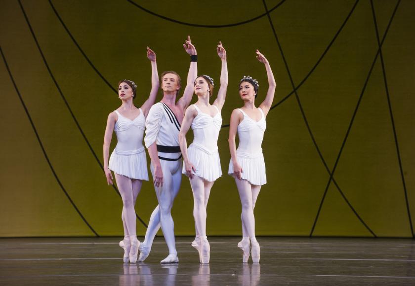 The six of them amply justified critic James Monahan’s belief that Symphonic Variations is “one of the most enduringly beautiful ballets in the British or any other repertory” - indeed, after last night’s performance, I couldn’t agree more. Elegant, looping black lines dance on Sophie Fedorovitch’s lemon yellow backcloth (pictured left), and on her one-shouldered black and white costumes for the men – surely some of the loveliest in abstract ballet. The same beautiful curving lines appear in the dancers’ limbs – the women’s arms come up to half-frame, half-embrace their partners’ heads, or their hands reach to the heavens before spiralling gently down, passing across the heart. César Franck’s score, too, with Paul Stobart on solo piano, is just right, poignant and serene. The whole effect is of deep tenderness, expressed through breezy cleanness: it’s the post-war design aesthetic of the 1951 Festival of Britain, Lucienne Day wallpaper for the soul.
