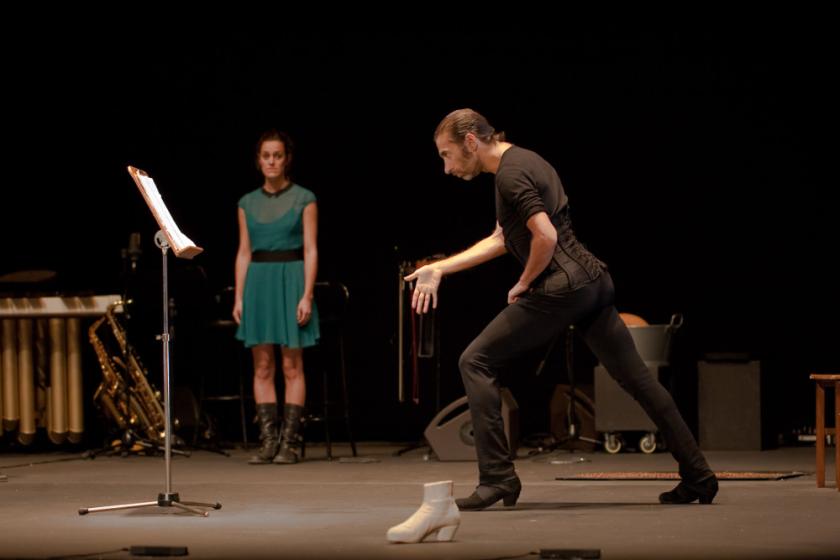 The 90 minutes that followed proved that any prophecy would indeed have been a waste of breath. He smashes a ceramic flamenco boot (after playing it like a flute). He pretends to read his dance steps off a score on a music stand, while wearing a chef's apron. He hits a bass drum with his head. He gets off the stage and spends five minutes dancing in the stalls in a blackout. He pulls up his shirt and plays percussion on his belly. He pins sheets of paper to his clothes. There is contemporary flamenco – the kind of thing we will see later in the festival from Manuel Liñán – and then there is what Galván does in a show like this: Tanztheater in heeled boots; a dance concept album; performing art as performance art.