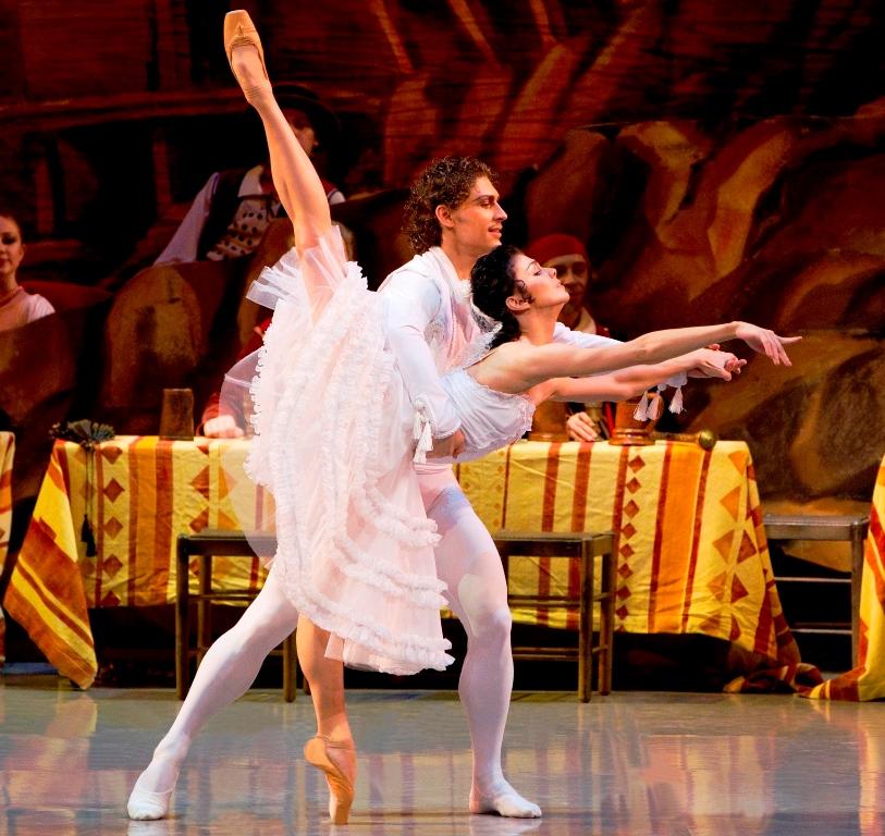 Within this story, two separate historical narratives unfold, one dance, one political, both fascinating. The political one is more obvious – the ballet was created as the Nazis threatened in 1939, and the people rising up, only 20 years after they did so in actuality in Russia, makes for fine stirring drama. (This production also uses historical bits of film during the overture and scene drop to good effect.) The death of Don Fernán, when his helmet is carried on a pike, is an overt reference to the French Revolution.