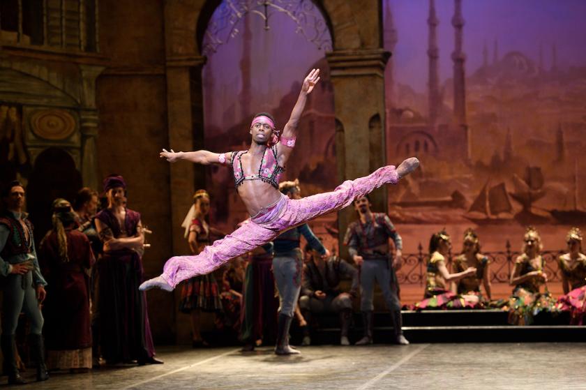 The major lure of Le Corsaire for a ballet company is the unusual number of flamboyant roles for men, and impressively ENB has imported only two of its soloists. Francesco Gabriele Frola from the National Ballet of Canada on first sight seems a rather lightweight Conrad – until you see him jump. Some of his elevations, from a standing start, with fancy add-ons, drew gasps on opening night. Brooklyn Mack, on loan from Washington Ballet, is dangerously elegant as the wicked slave trader Lankedem. His big numbers are all over by the first interval, but his shadow hangs over the remaining two acts as he lurks on the sidelines like a dealer in crystal meth. You’re aware at any moment that he might pounce again. And pounce he does.