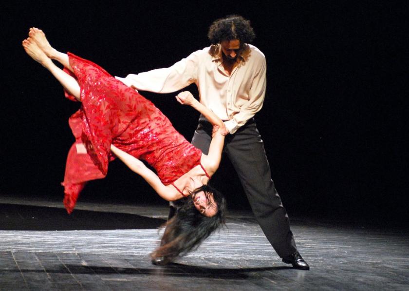 All the same, Nefés is more textured than Ten Chi, or Nur Du either (the Los Angeles one). "Nefés" means "breath", and there's life and sweetness in some of the male-female vignettes. There are also three or four little jewels of choreographed fantasy that ought to be preserved under glass to look at and love forever. A woman bearing water bags on her head apparently climbing a staircase in air, her feet walking in the hands of two men. Another wee creature being treated as a baton one moment and a paper plane another, twirled and launched by a relay of men with impressive dexterity and gravity-defying ingenuity - a child having a whale of a time. An exultant final chain of men shuffling ingeniously along the floor draping their arms over their knees invitingly like Michelangelo’s Adam, while the women reciprocate with a line of captivatingly delighted, embarrassed and aroused squirms. (Pictured above left)