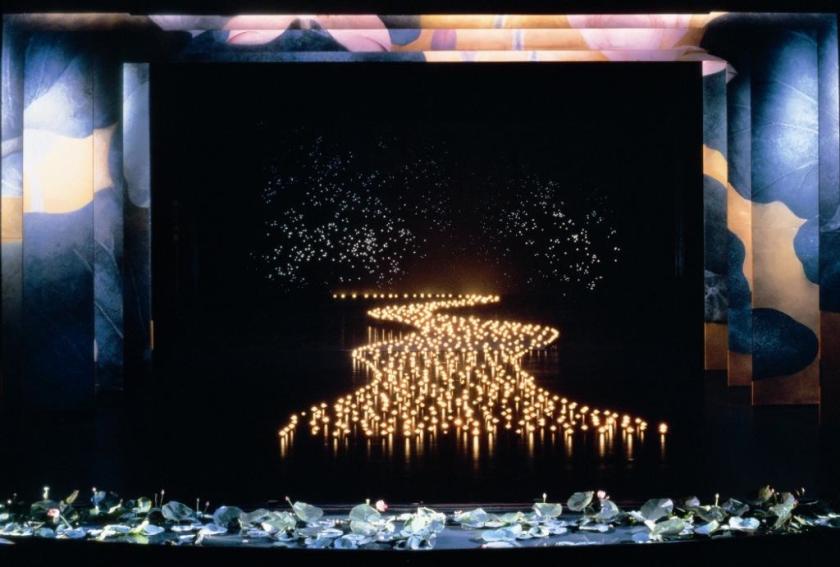 The phoenix-like revival of the epic, first premiered in 1993, seems especially pertinent since resurrection is a recurring theme. Accordingly, a bed of lotus flowers, symbols of rebirth, fills the orchestra pit and designer Ming Cho Lee has covered the set with huge lotus blossoms enlarged from a painting by Taiwanese artist Lin Yu-San.