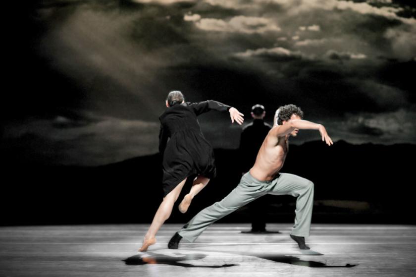 The full company enter to perform in archetypal NDT1 unison. We see sporadic solos, long lines of dancers, bare breasted women and men in black puffy trousers, their movements apposing syrupy stretches and small, quick kinesics. It is a fabulous display of abstract, gestural contemporary ballet, but although the concept is impressive the overall effect lacks emotional resonance.