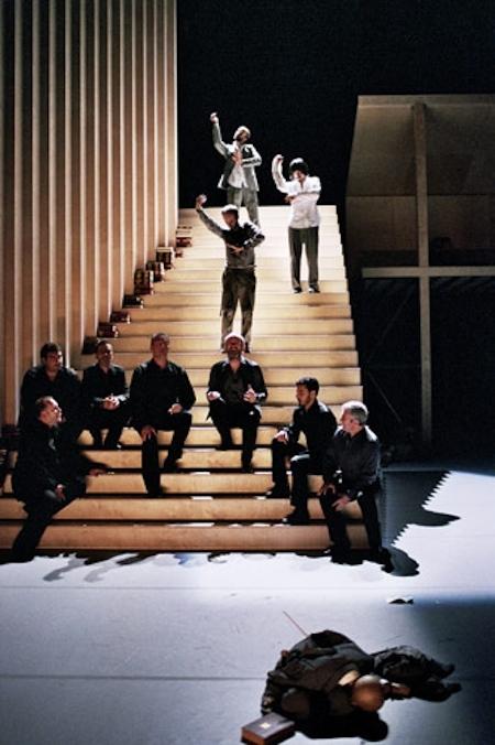 I wish it were Apocrifu instead that would be visiting other theatres - one night only in Brighton for this work, as substantial and taut as Gardenia was slack and trite. A high bleached wooden staircase to the left, an outdoor shelter to the right, whose woodpile turns out to be of dozens of books. Singers in black (the A Filetta polyphony group) discreetly come and go, like ghosts, their voices warbling and droning in the dark, their faces scrunched up raptly as they sing.