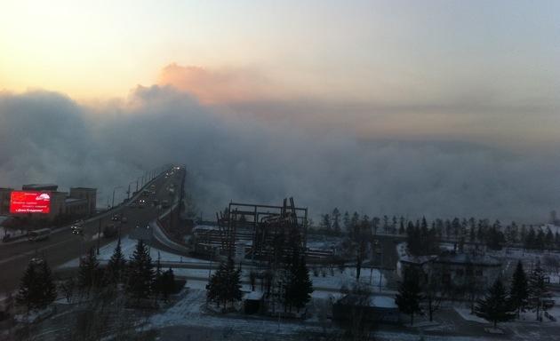 In England you may joke about having Siberian weather with minus 7 degrees. This is really what Siberian winter looks like - at minus 26 degrees. The river is gushing steam, a hellishly peculiar sight. After travelling for 16 hours and through seven time zones to get to Krasnoyarsk at six in the morning, I am not sure I’m seeing what I’m seeing.