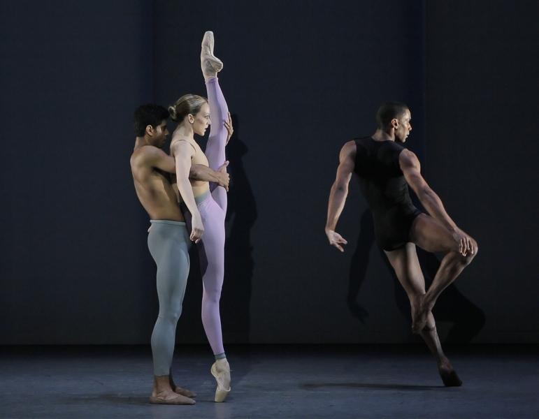 McGregor doesn’t echo this structure choreographically; he uses nine dancers (his use of odd numbers – the full cast is 11 – is intriguing) in a masterly structural display of choreographic quick-change. On an initially brightly lighted stage, lines of dancers move forward with military briskness, then dissolve into quick pas de deux for different pairs (the marvelous Sterling Hyltin gets her moment here, pictured below right), groups forming and dissolving behind. Midway through, the lights (by regular McGregor collaborator Lucy Carter) darken and catch the dancers in grid-like blocks of colour. Then in an echo of the opening section, a pair dance in the centre of a circle of light, a woman walks around its perimeter, and suddenly they coalesce into trios, moving with the same steps but on different trajectories.