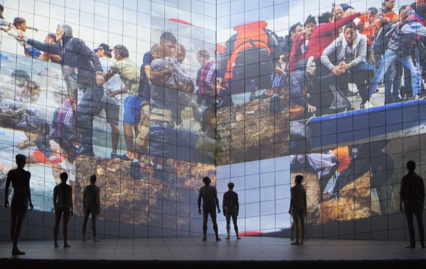 In Multiverse, the backdrop briefly features scrambled versions of images highly resonant for this theme of flood and catastrophe: refugees in small boats in the Mediterranean (main picture), and The Rape of the Daughters of Leucippus by Rubens. For a stunning moment, I thought we were going to see something new from McGregor: a hard-hitting political piece about violence, exploitation, and rising waters, something like John Akomfrah's utterly brilliant Vertigo Sea (currently displayed at Turner Contemporary in Margate next to Turner's The Deluge). The programme notes by dramaturg Uzma Hameed reveal that these ideas were indeed present during Multiverse's development: the piece, it is implied, takes its cue from the way Rashid's fragmented paintings offer different perspectives, challenging notions of linear time and reframing monolithic historical narratives to expose the "cruelty and chaos" underneath.
