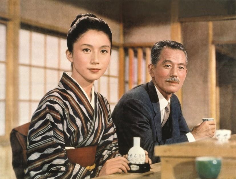 Ozu is a master of intonation (the frequent "h'mm" which speaks more than any words) and nuance, and the sense of a changing society, moving from the legacy of war towards industrial boom, is everywhere, not least in the differences of costume, from the traditional kimono to new western styles. The gentlemen’s working attire is strict three-piece suits, which become progressively more rumpled as the sake goes down - there’s a lot of imbibing in the film (pictured above right, Hirayama with his eldest son Kochi, played by Keiji Sada). The colour cinematography, by Ozu’s favourite lenser Yuharu Atsuta, is wonderful at dabbing patches of bright colour onto an otherwise restrained canvas, and the city of Tokyo itself still looks somehow modest, naïf, a far cry from the visual extravagance that we associate with it today.