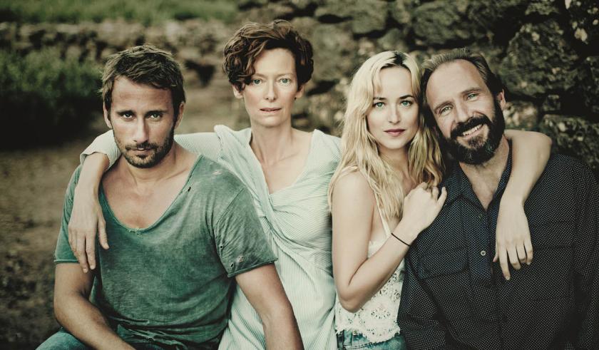 The couple sprawl luxuriously and nakedly around the pool at their idyllic island eyrie, where the view offers both craggy hillsides and sun-baked plains stretching away to the sparkling Mediterranean. However, the heat-haze is rudely ripped asunder by the whirlwind arrival of Harry (Ralph Fiennes), who announces himself with an in-flight phone call, demanding to be met at the airport. He greets Marianne like a long-lost lover, and just happens to have brought his sulky blonde daughter Penelope (Dakota Johnson, pictured below) along for the ride. To Marianne's indignation, the bumptious, controlling Harry even takes it upon himself to invite a couple of extra guests of his own, Mireille and Sylvie.